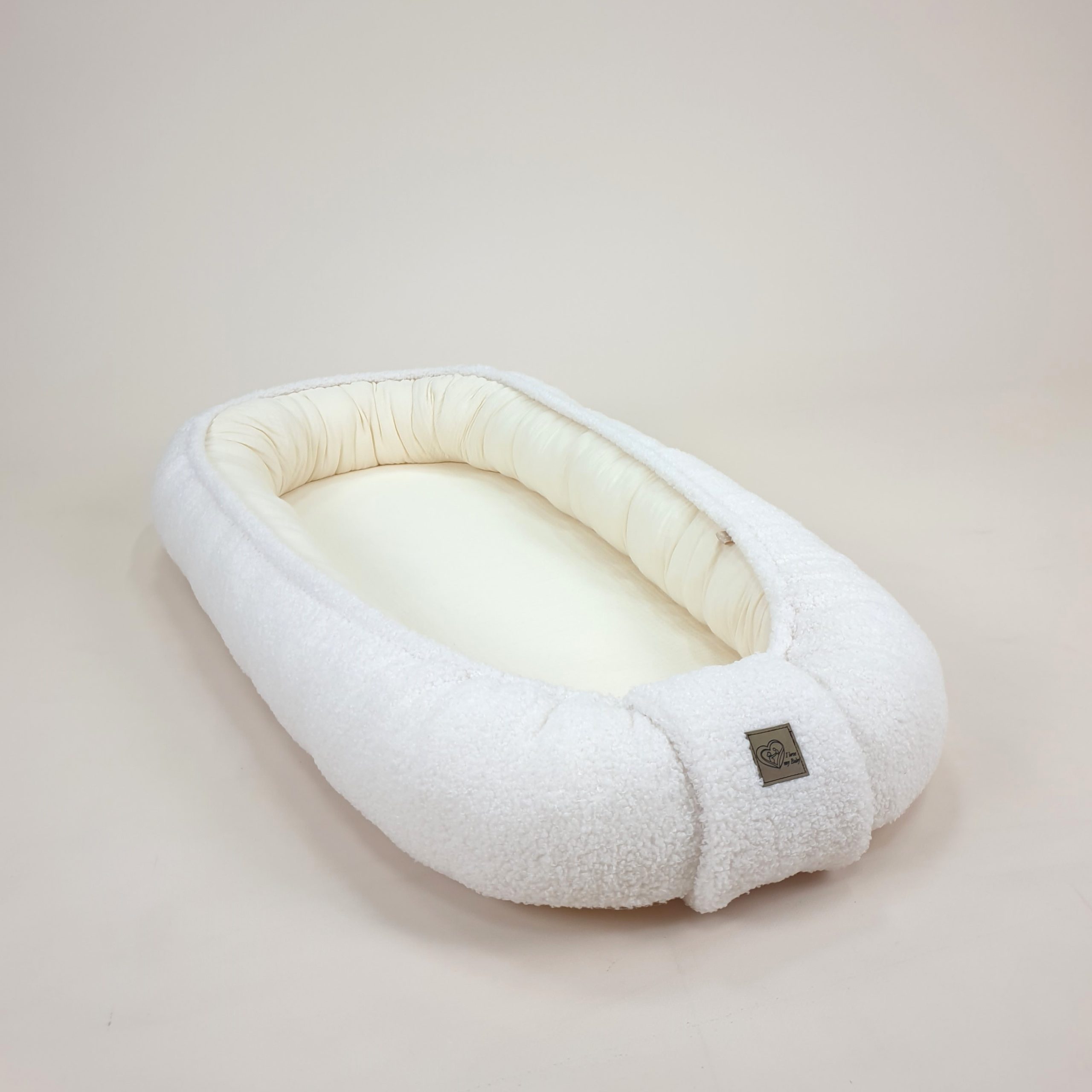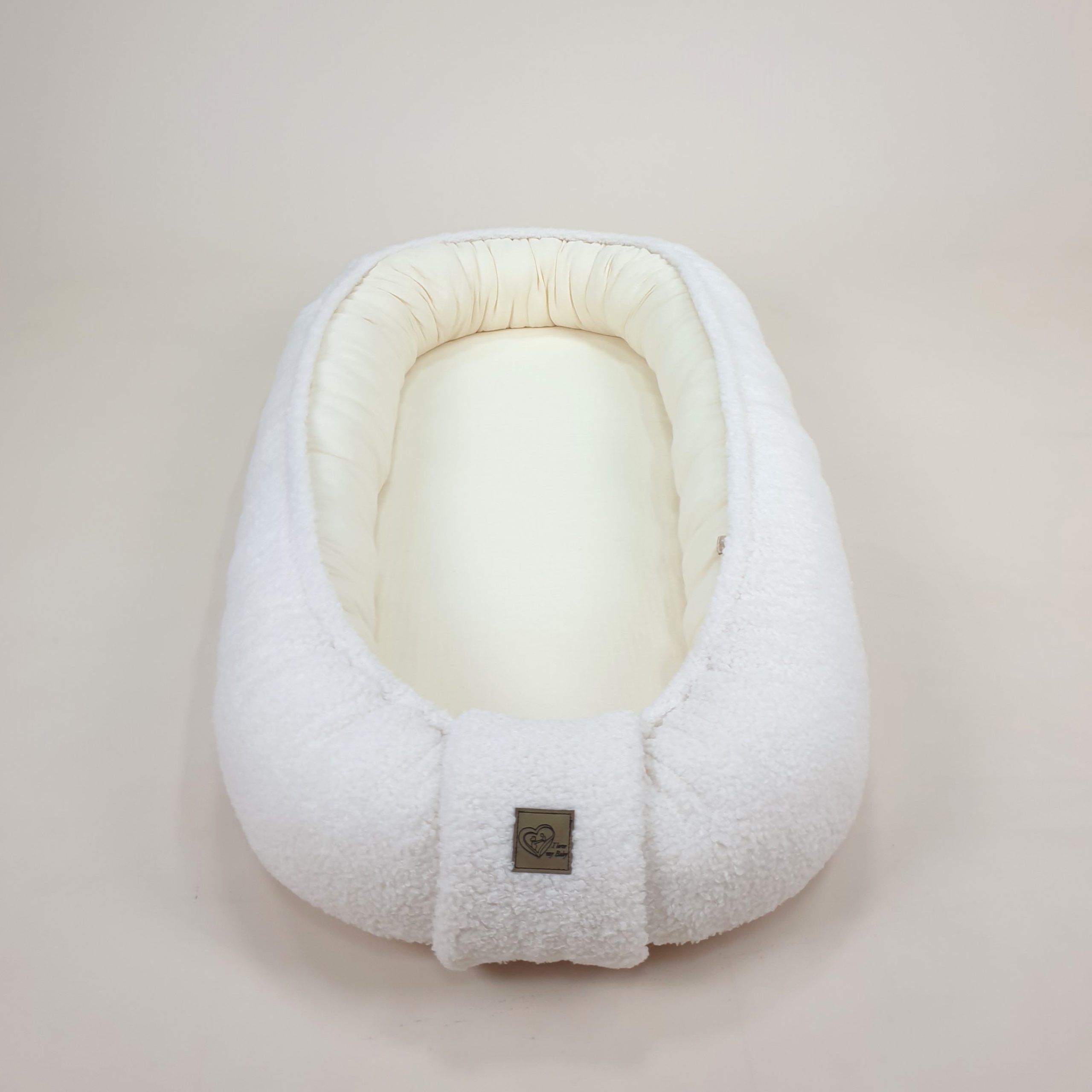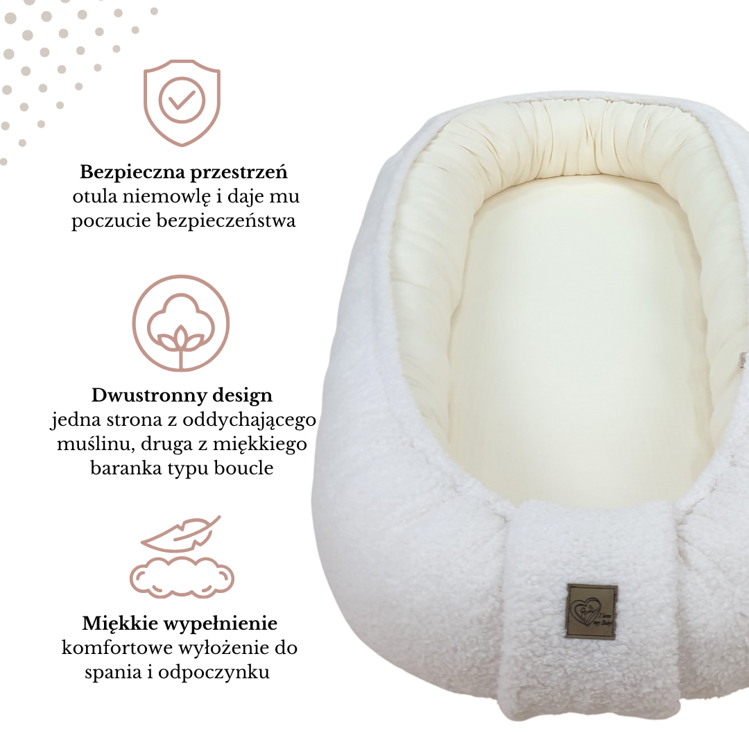 Jedna strona kokonu wykonana jest z miękkiego, przewiewnego muślinu, druga strona to wyjątkowo puszysty i przyjemny w dotyku baranek typu boucle, otulający dziecko miękkością i ciepłem.