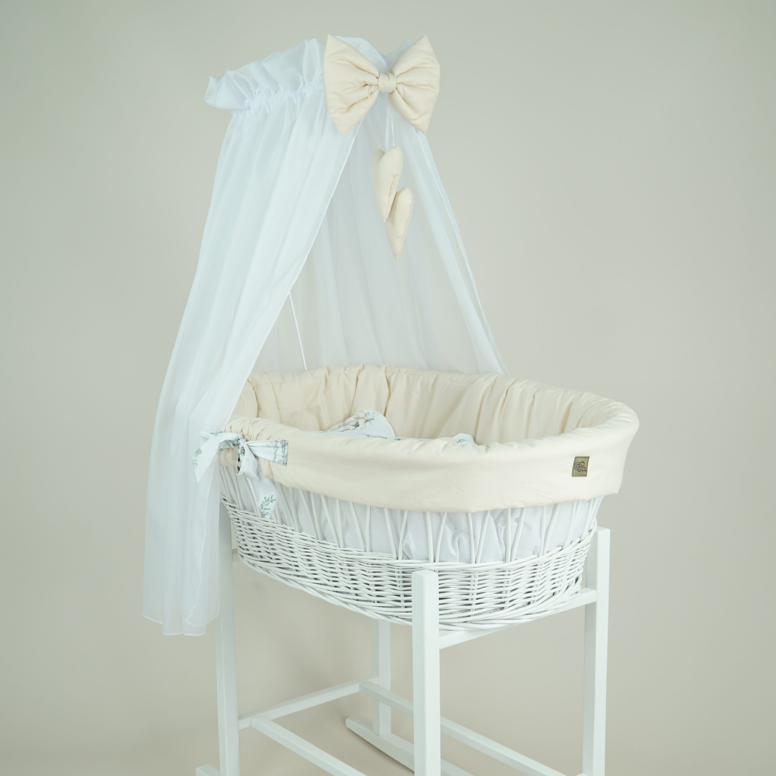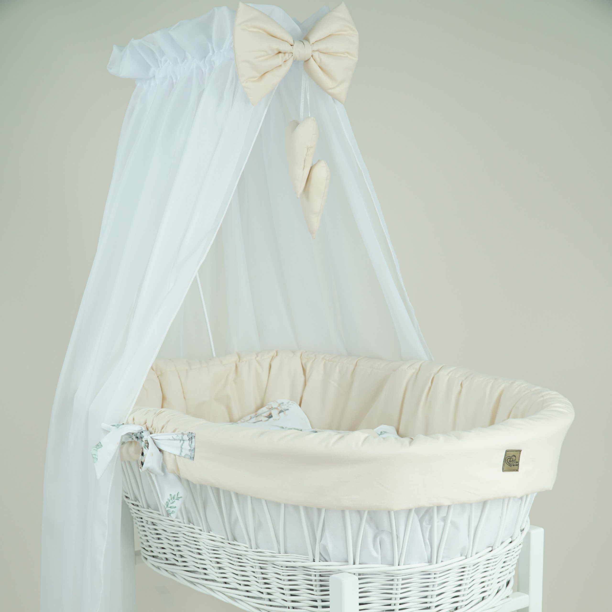 Baldachim dołączony do zestawu to doskonały akcent, który nie tylko podkreśla elegancję kosza Mojżesza, ale także pełni praktyczną rolę. Jego lekka, woalowa tkanina z uroczą kokardą i dwoma serduszkami wprowadza do wnętrza delikatny nastrój, jednocześnie skutecznie chroniąc maluszka przed nadmiarem bodźców zewnętrznych, zapewniając mu spokojny sen i poczucie bezpieczeństwa.