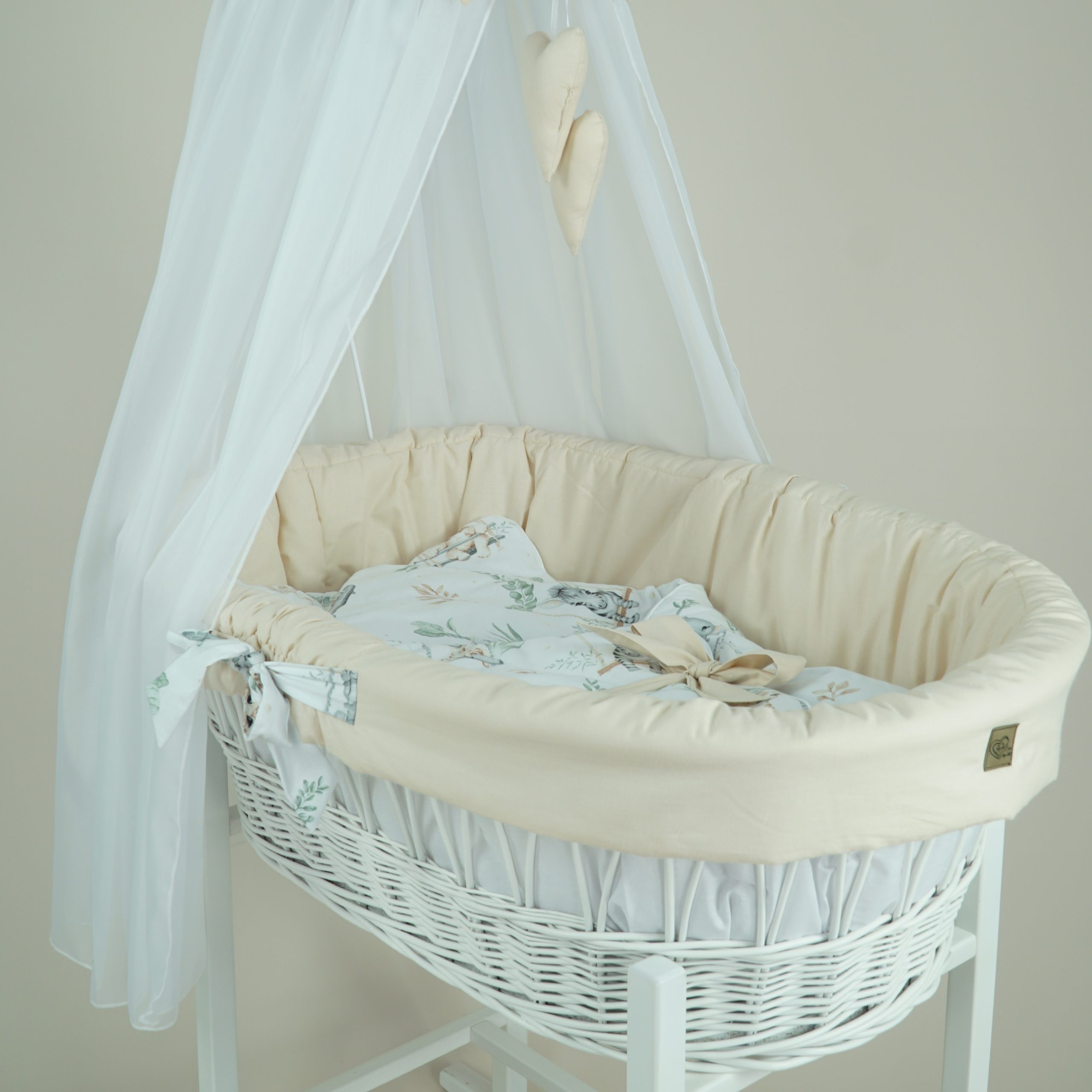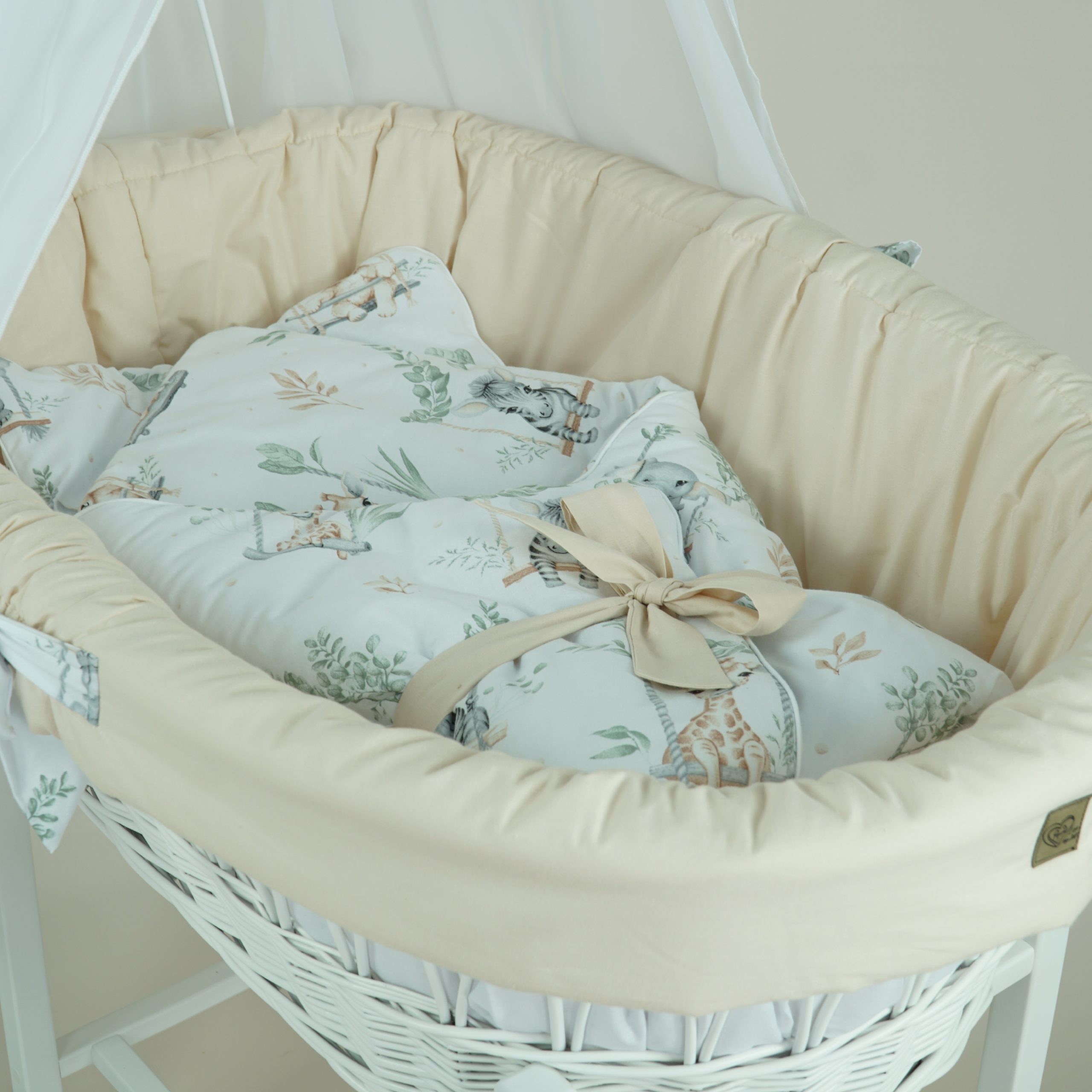 Wiklinowy kosz Mojżesza OLIWIA biały z kołyską na biegunach i pościelą kremową – safarii.
