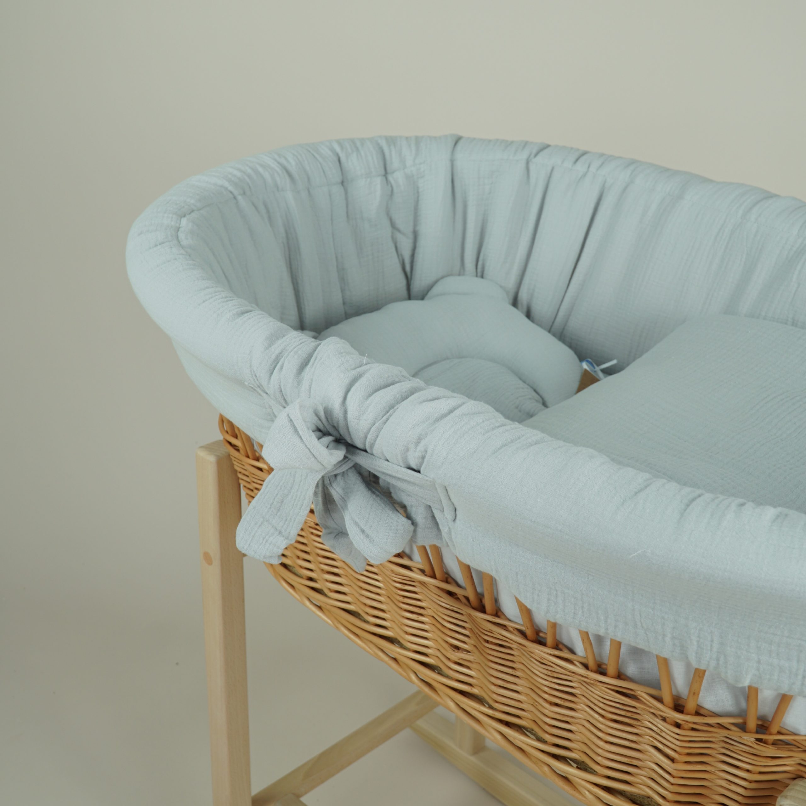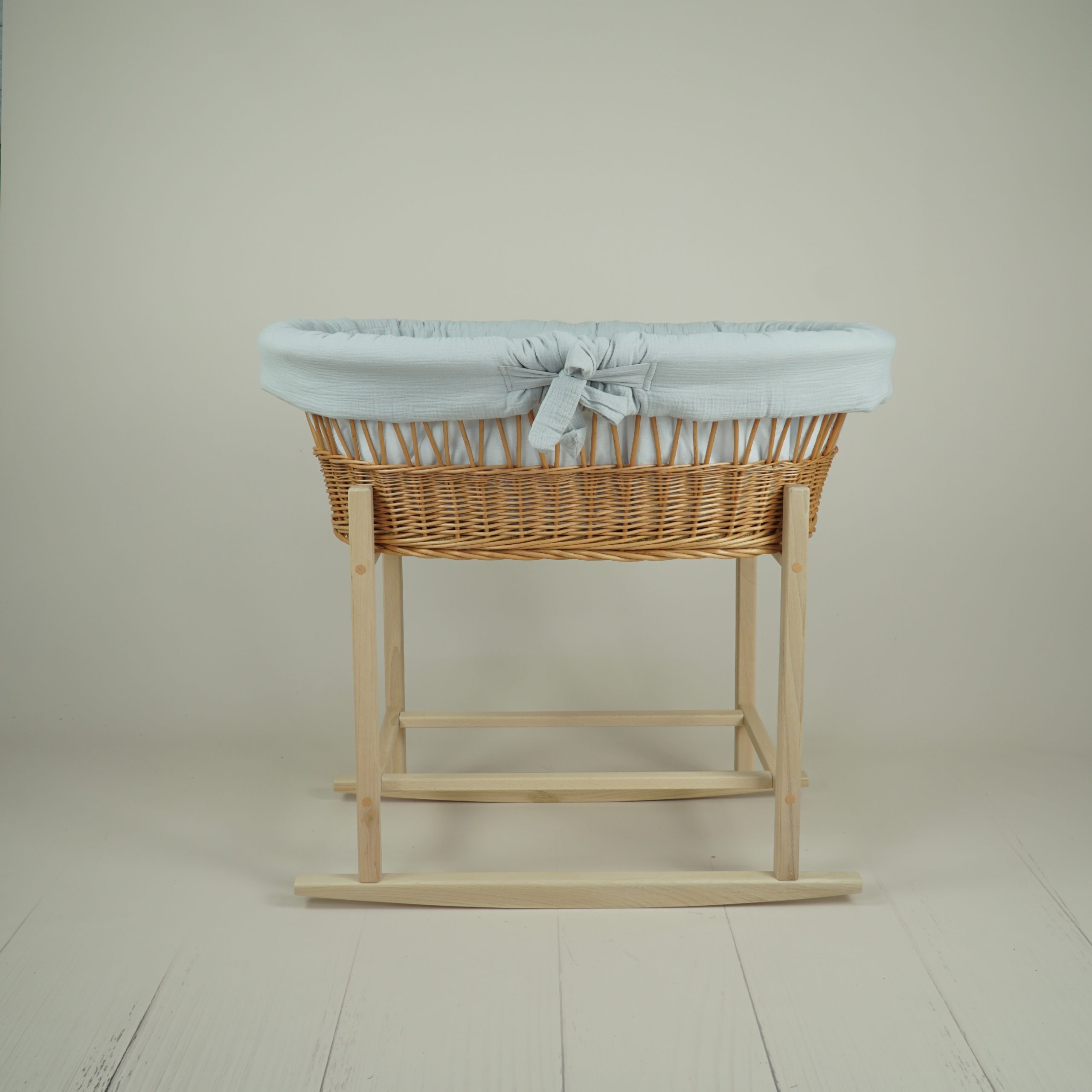 Wiklinowy kosz Mojżesza OLIWIA II naturalny z kołyską i pościelą muślinową – szarą.