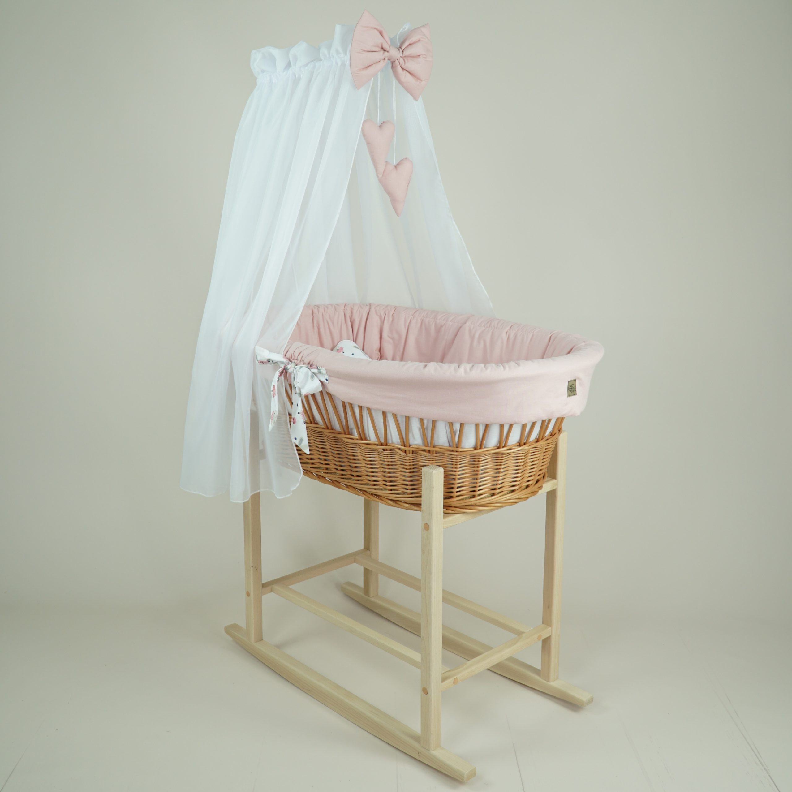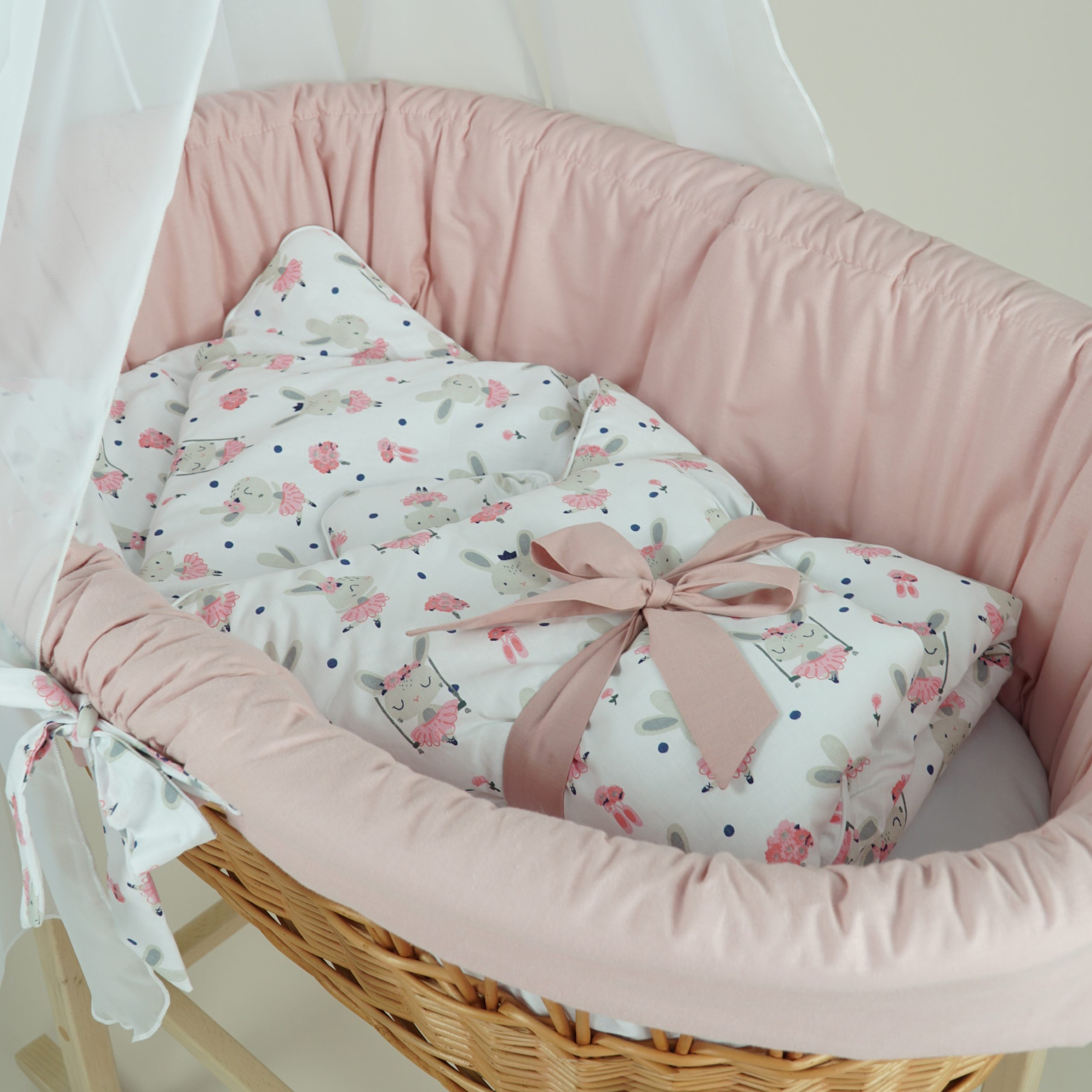 Wiklinowy kosz Mojżesza OLIWIA naturalny z kołyską na biegunach i pościelą różową – zajączek.