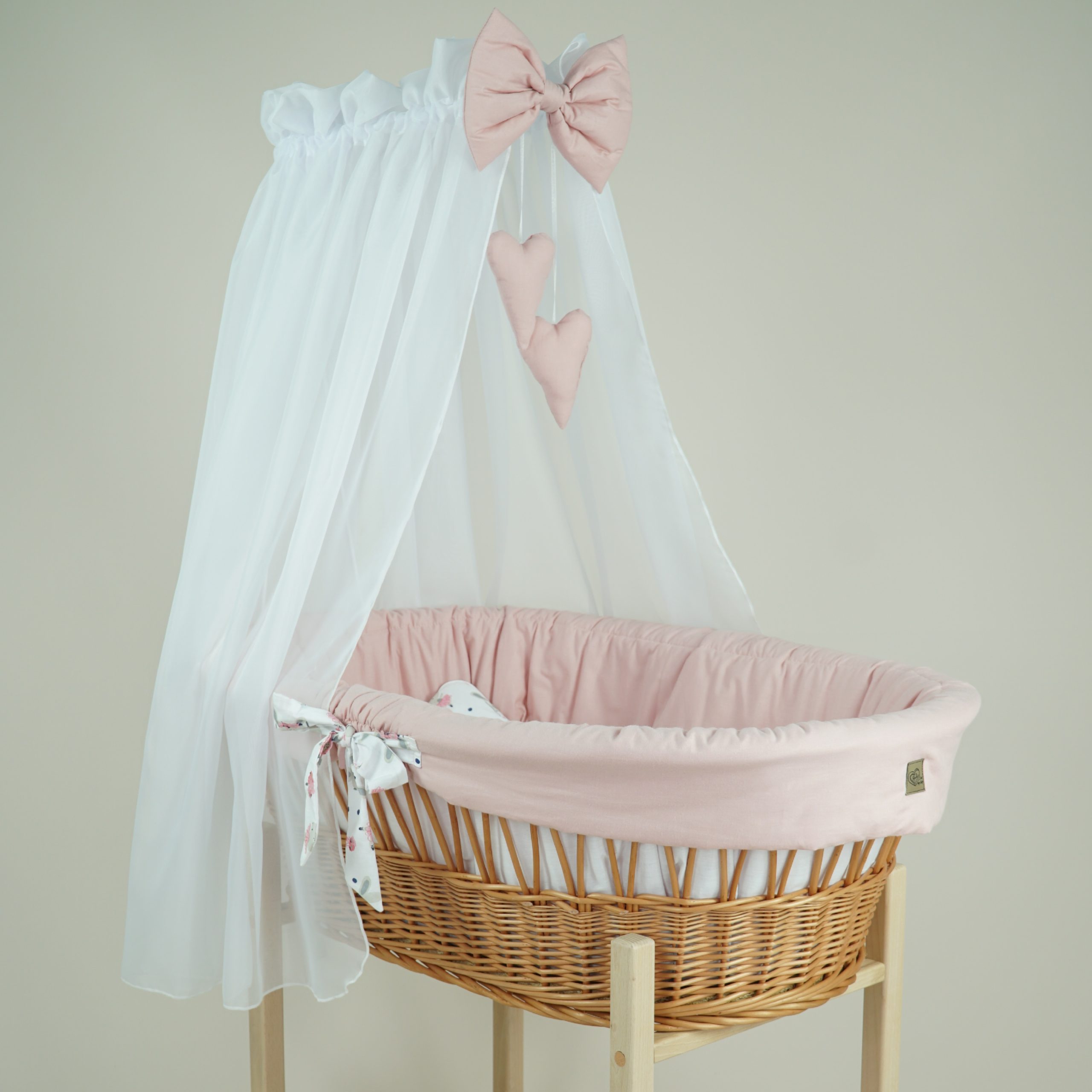 Baldachim dołączony do zestawu to doskonały akcent, który nie tylko podkreśla elegancję kosza Mojżesza, ale także pełni praktyczną rolę. Jego lekka, woalowa tkanina z uroczą kokardą i dwoma serduszkami wprowadza do wnętrza delikatny nastrój, jednocześnie skutecznie chroniąc maluszka przed nadmiarem bodźców zewnętrznych, zapewniając mu spokojny sen i poczucie bezpieczeństwa.