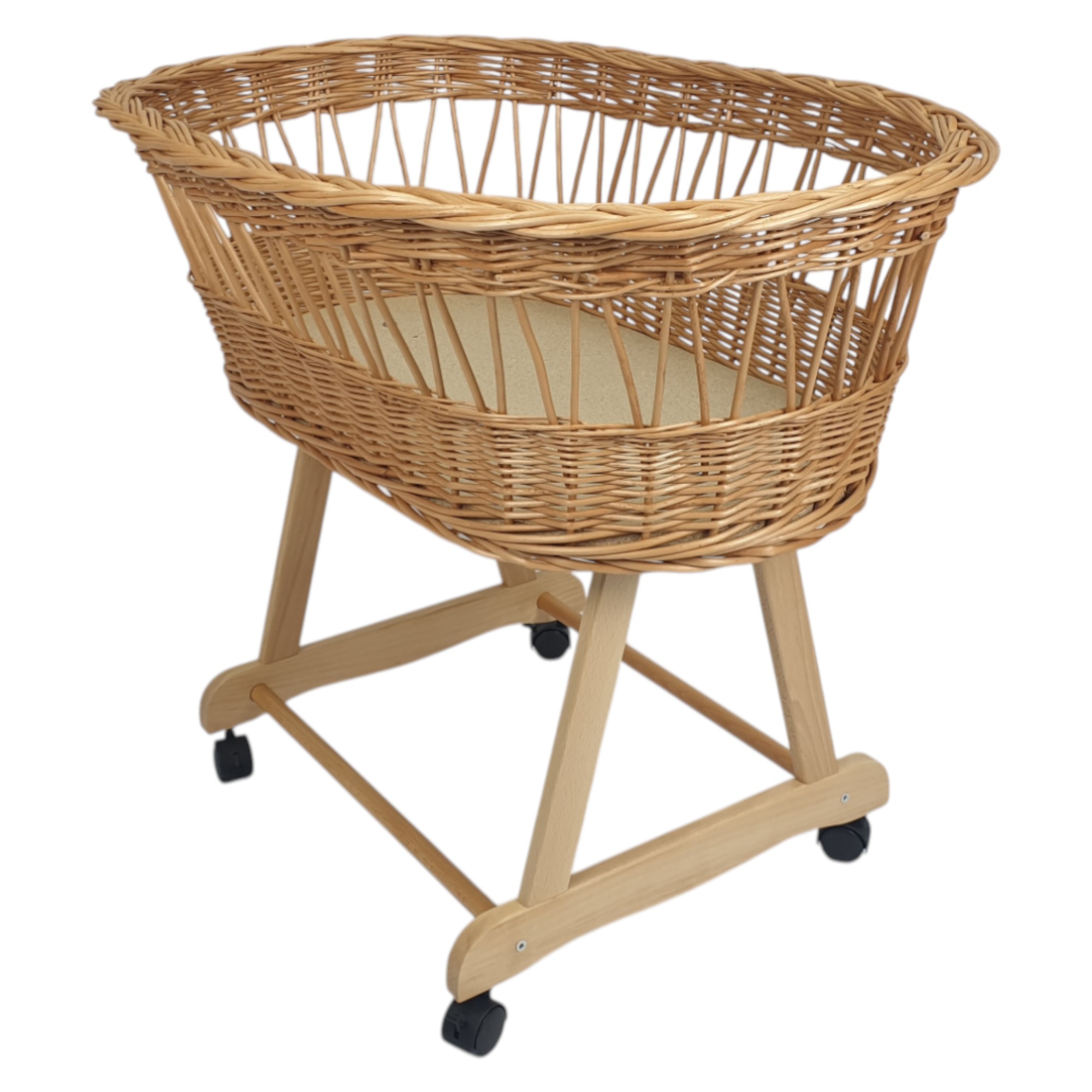 Wiklinowy kosz Mojżesza z drewnianym podwoziem w kolorze naturalnym.